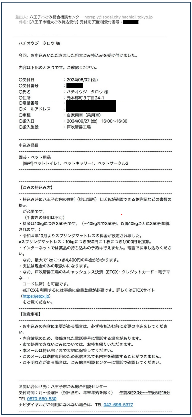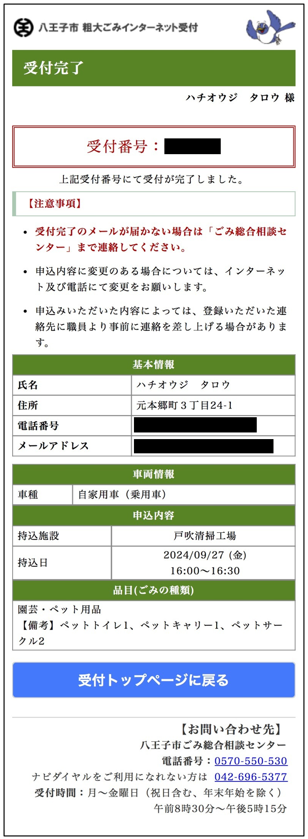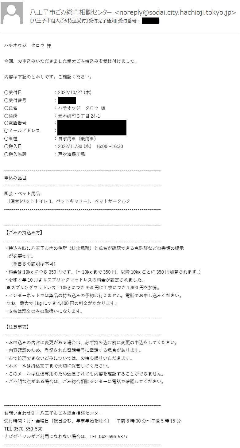 受付完了後に登録したメールアドレス宛に届く受付完了メールです。