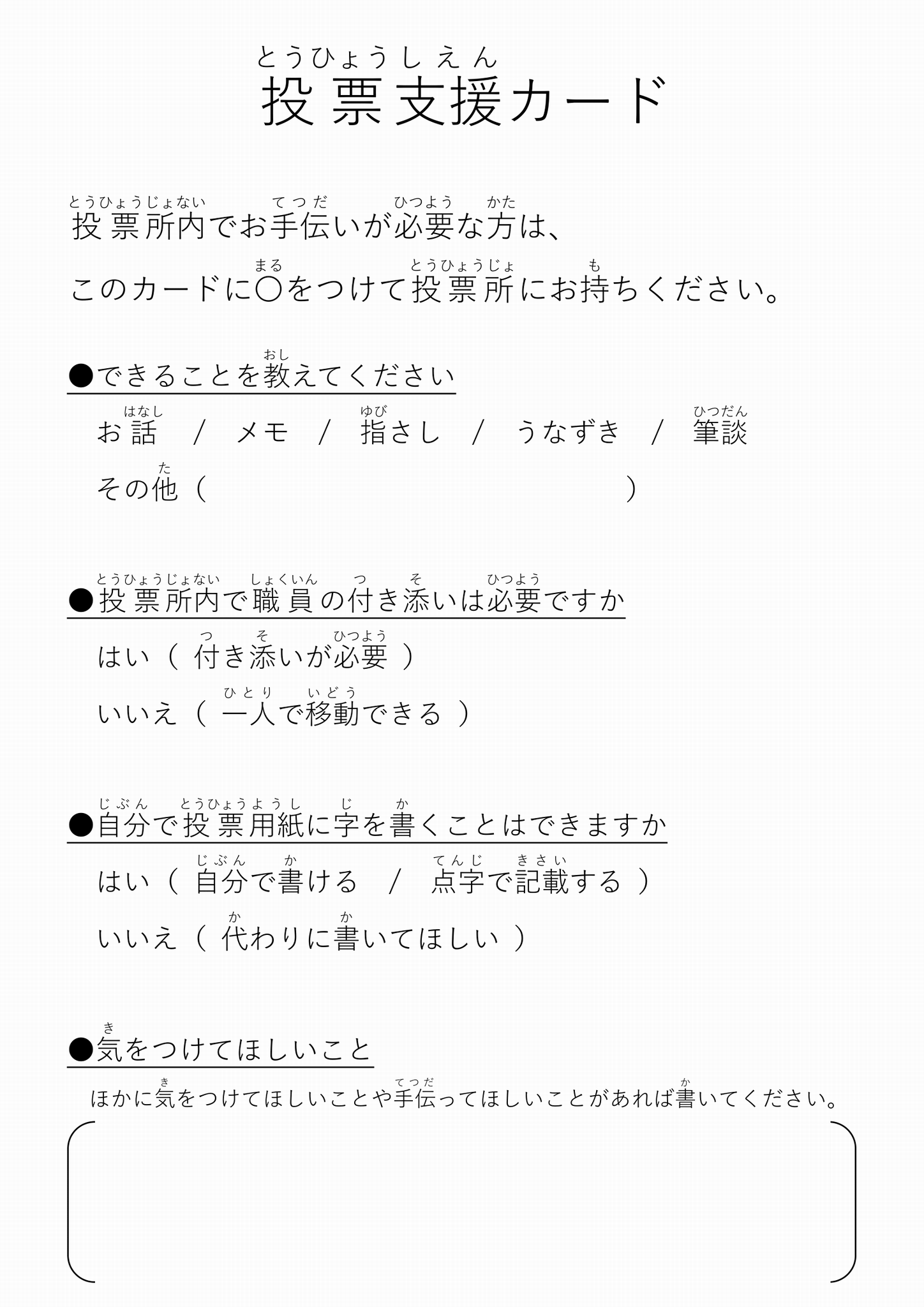 投票所内で職員による支援(お手伝い)を希望される方は、投票支援カードに支援してほしいことを書いて投票所の職員に渡していただくと、スムーズに投票することができます。こちらからダウンロードし印刷してご利用ください。