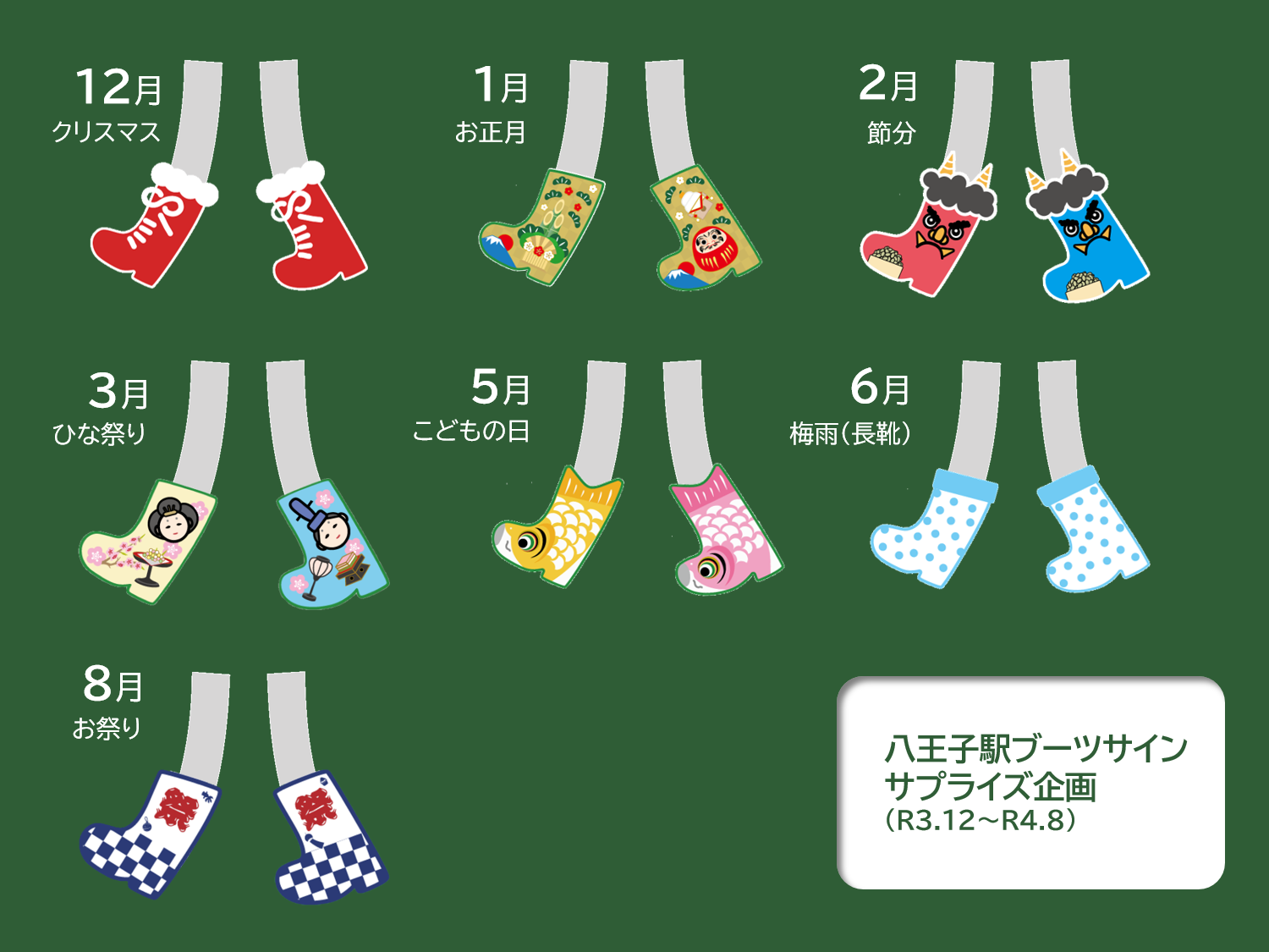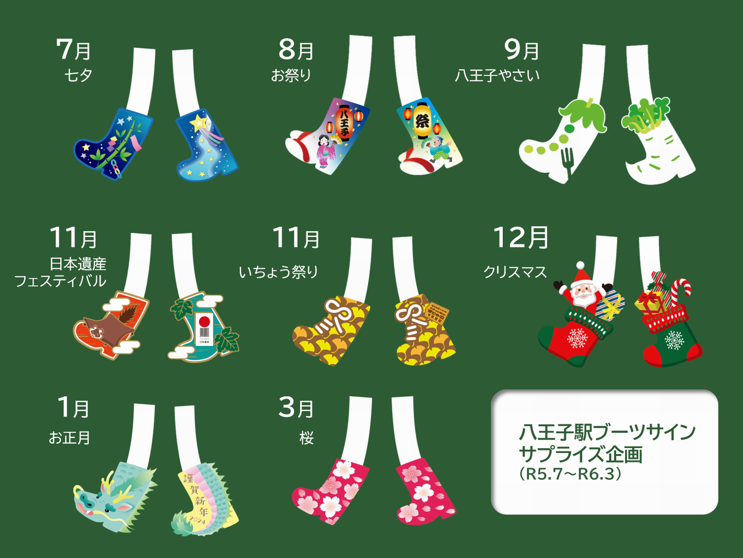 ブランドロゴのチャームポイントである「靴(ブーツ)」を、八王子駅の駅名看板の「八」に履いてもらうというもので、市と駅が一体となり、まちの玄関口である八王子駅から「自分らしいみちをあるいていこう!」というメッセージを発信することを目的としています。