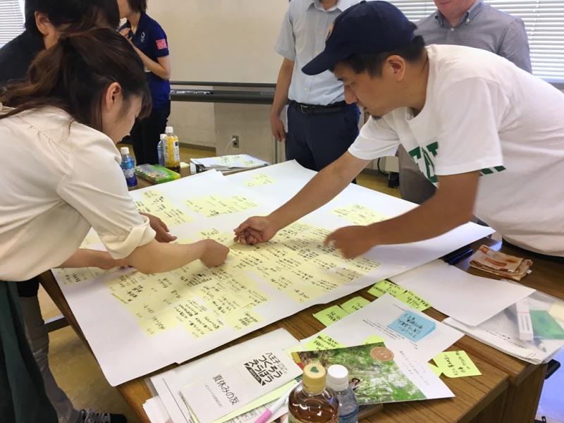 河井教授による講義が終了し、いよいよグループワークがスタート。参加者のみなさんには事前に、「ひと」「もの」「こと」「ところ」「仕事」「わざ」「過去」「未来」「空気」という9つの視点から八王子市の魅力を付箋に書き出しておく、という宿題が出されていました。各グループ、参加者一人ひとりが付箋に書いた言葉とその意図を説明しながら、次々と模造紙に貼り出していきます。はじめは緊張からか言葉少なだったグループも、徐々に打ち解けていったのか、和気あいあいと議論が繰り広げられていきました。