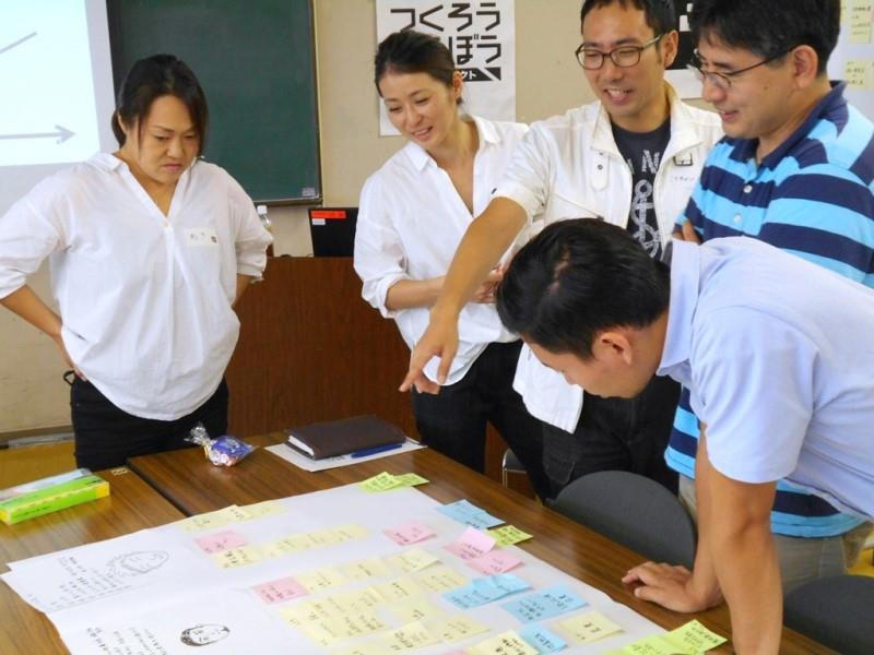 河井教授の言葉を受けて、早速グループワークがスタート。第1回ワークショップで打ち解けたからか、グループ内でのディスカッションも最初から盛り上がっている様子。例えば、結婚間近の男性をペルソナに置いたグループでは「結婚式の内容で意見が分かれてケンカになったとき、市内の飲食店の女将にたしなめられて立ち直るってストーリーはどうだろう?」「子どもが生まれたらどうかな?」などさまざまなストーリー案が生まれていました。