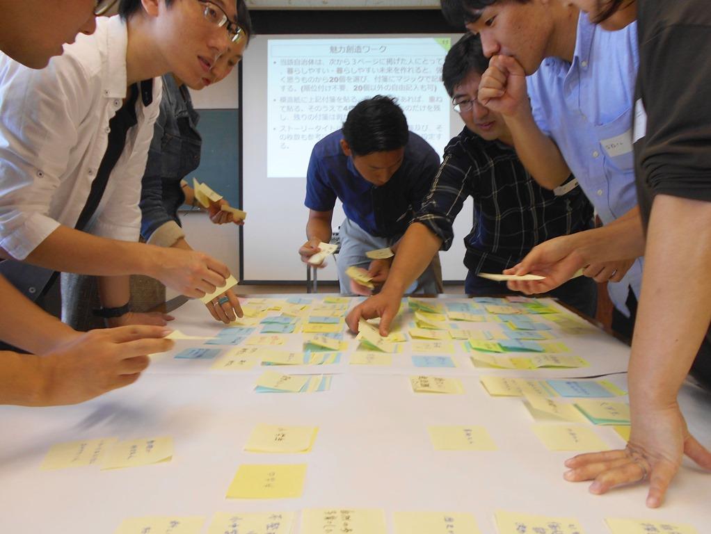 過去3回は、「みんなで八王子の魅力を出し合い」、「八王子の魅力をストーリーに仕立て」、「その魅力を体感するバスツアー」を実施。今回は、いよいよ最後のワークショップということで、ブランドメッセージの「市民案」(=八王子でどんな暮らしができるのかの明文化)」の制作が行われました。