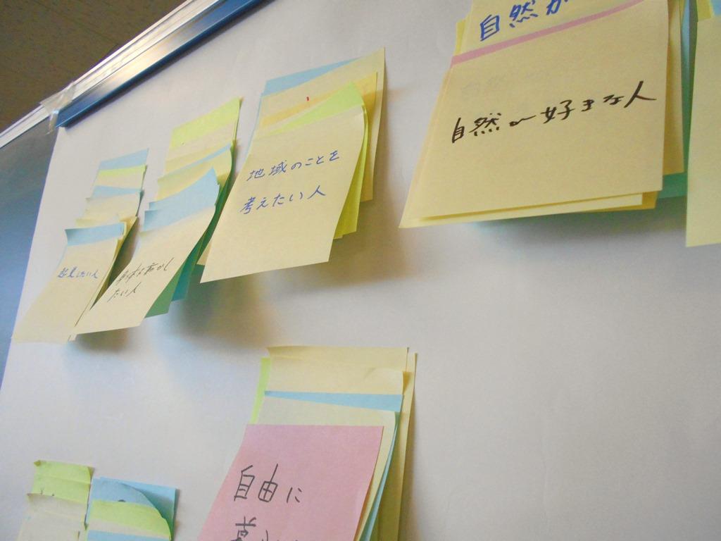 タイトル完成後、全員に「小学生の親」「静かに暮らしたい人」「社会貢献したい人」など、数十種類にものぼる人物属性が書かれた資料が配布されました。次のワークは、その中から「八王子でなら暮らしやすい未来をつくることができる」と思う人を、各自20枚ずつ付箋に書き出していくというもの。記入が終わったら、参加者全員の付箋を一枚の模造紙に貼り出していき、最終的に4人以上のメンバーがあげた属性だけを残します。これによって、「八王子での暮らしに特に向いている人」を示す「地域ヒートマップ」が完成しました。