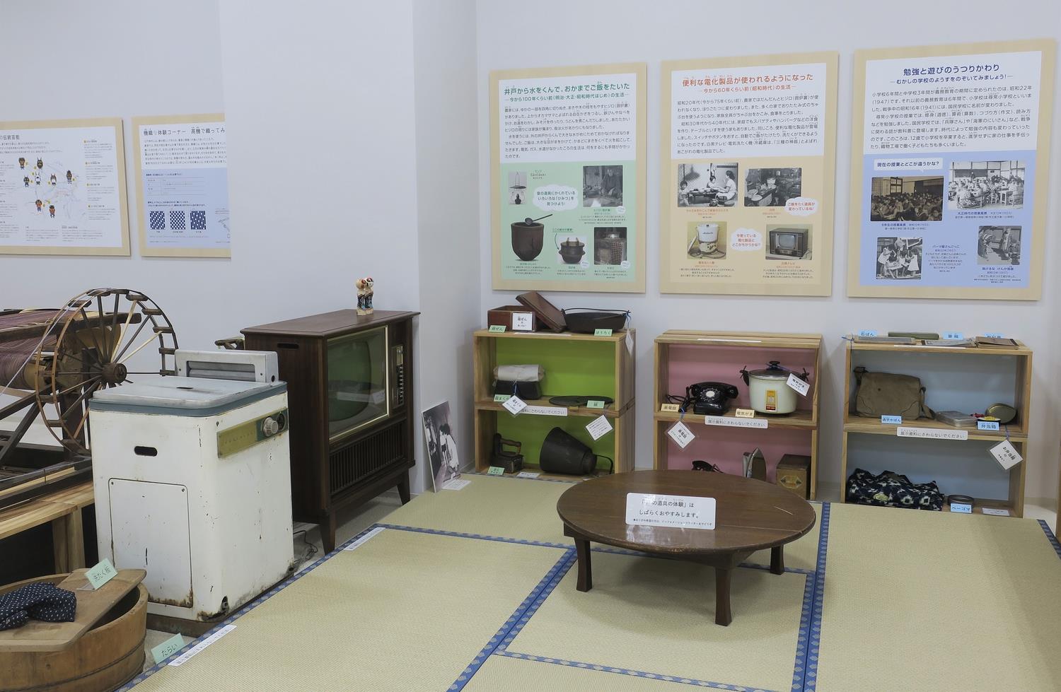 むかしのくらしや学校での生活を紹介する「たたみの部屋」では、実際にむかしの道具を間近で見て触ることができます。こどもには新鮮、おとなには懐かしい空間です。