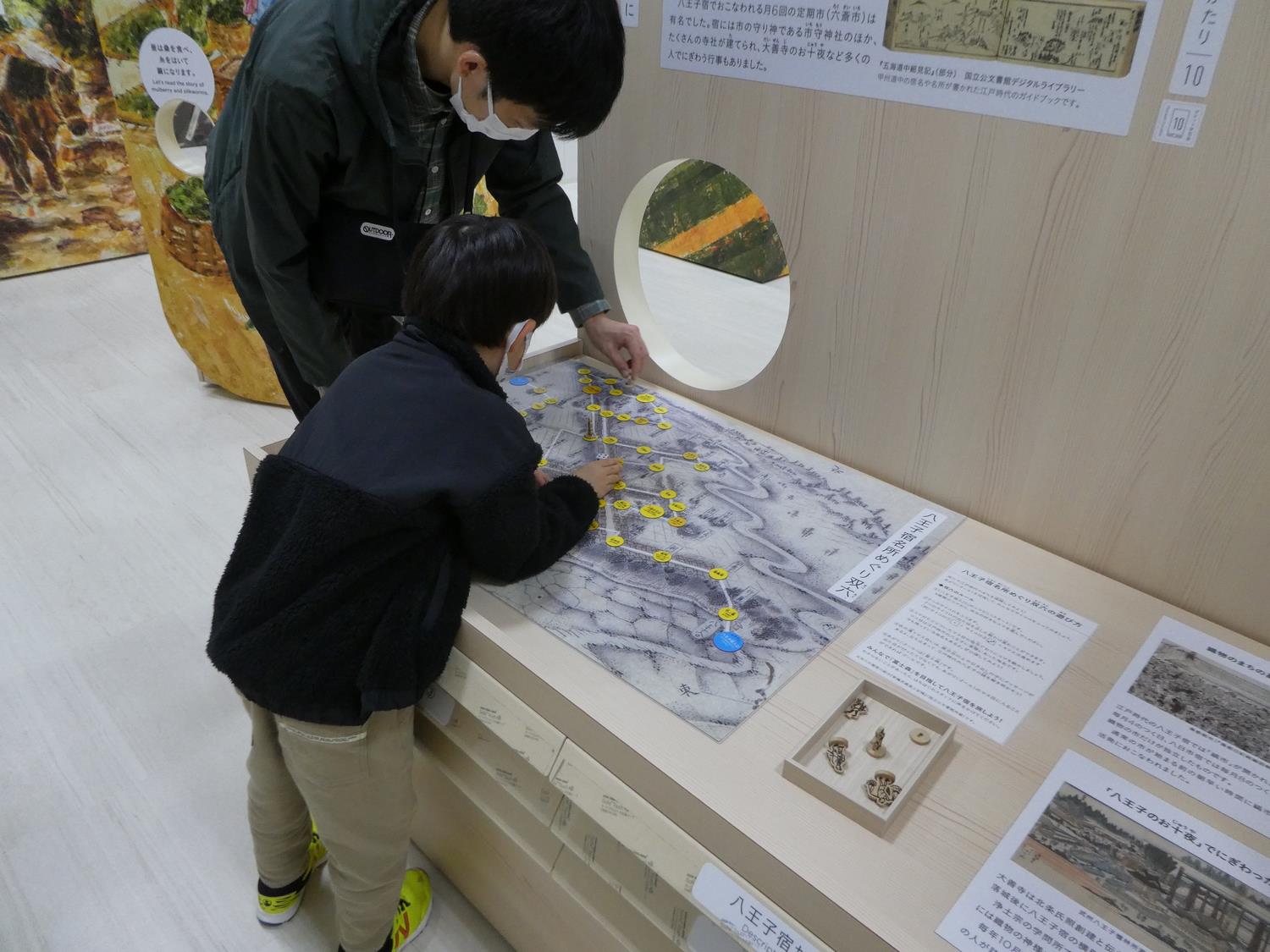 甲州道中の宿場町として発展した八王子宿。まちの様子やそこに住む人々、幕府に仕えた千人同心の活動について紹介。双六で八王子宿をめぐったり、タッチパネルを操作して八王子宿を探検しよう!