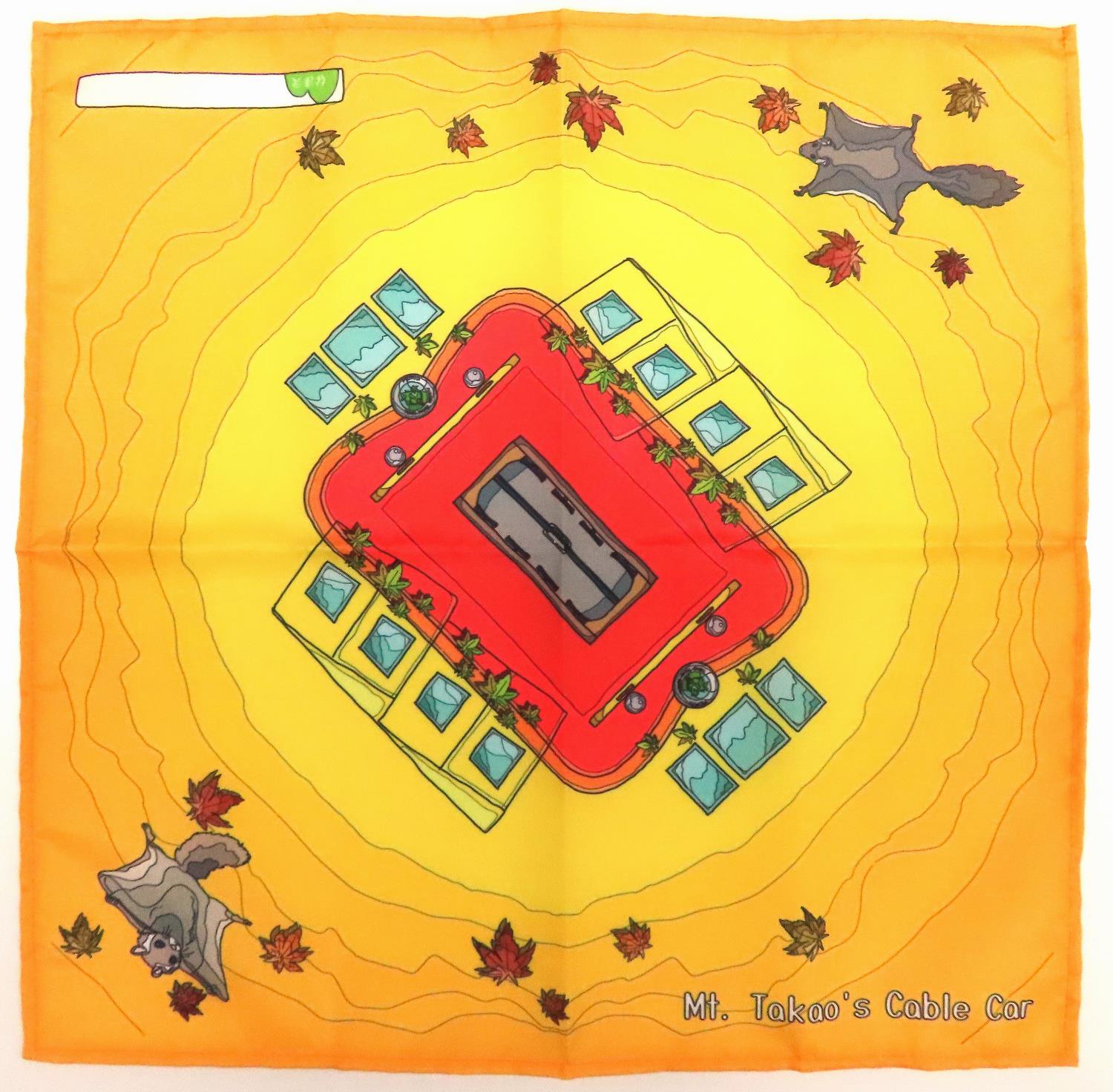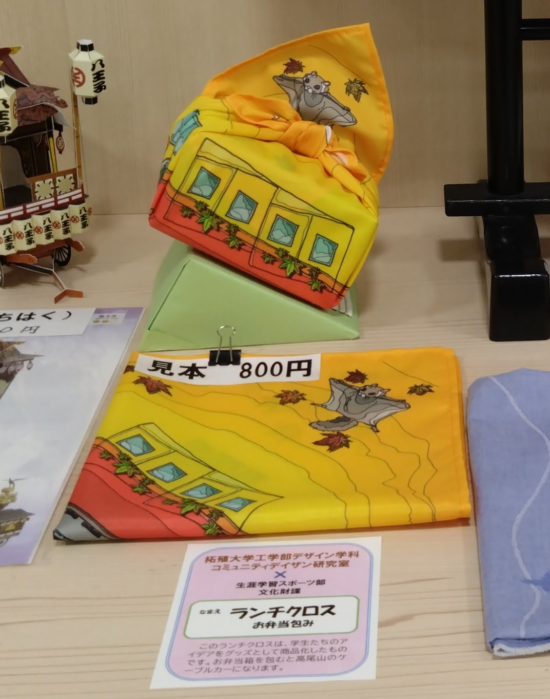 拓殖大学との共創による「高尾山のケーブルカーのランチクロス」(サイズ 39cm×39cm)を800円で販売中!