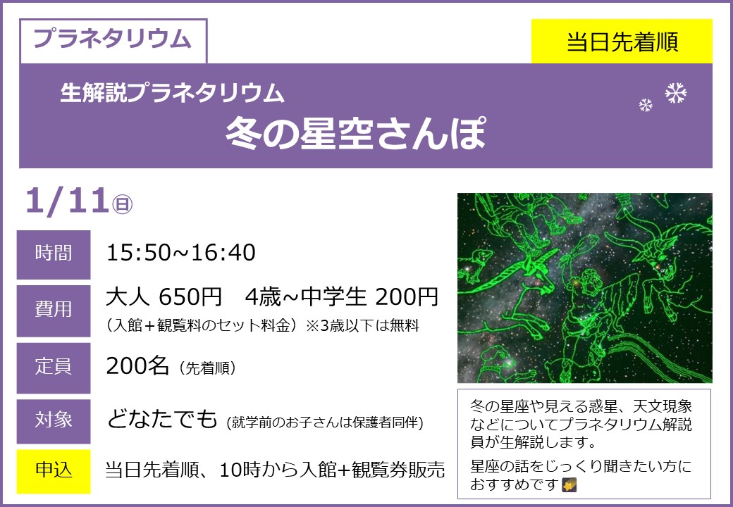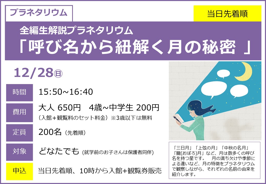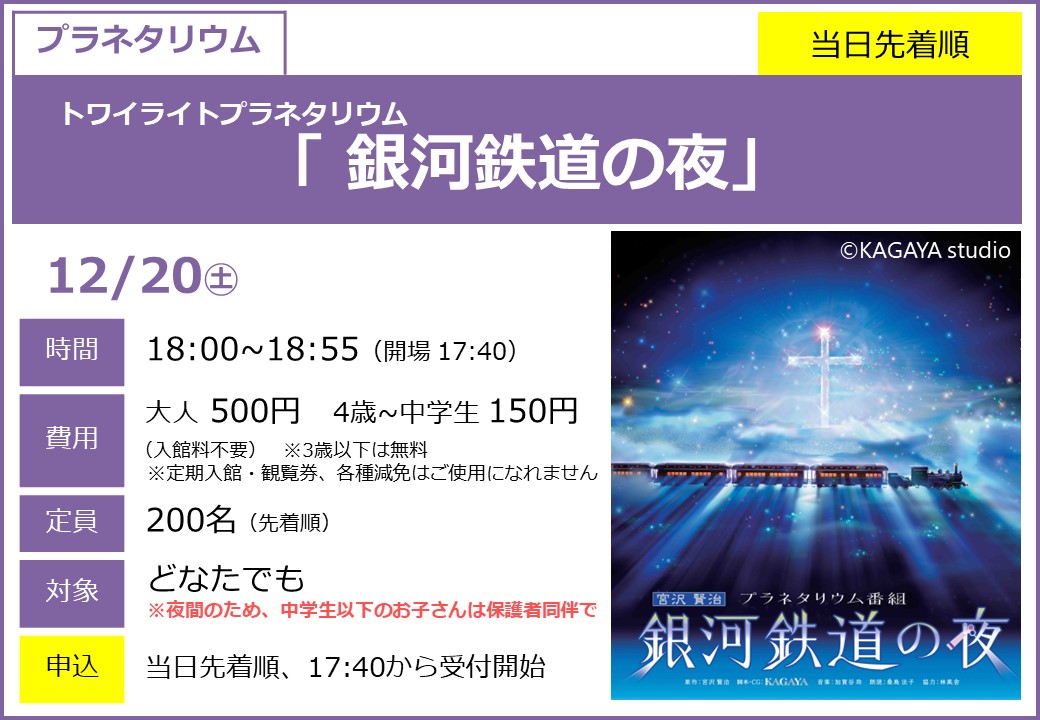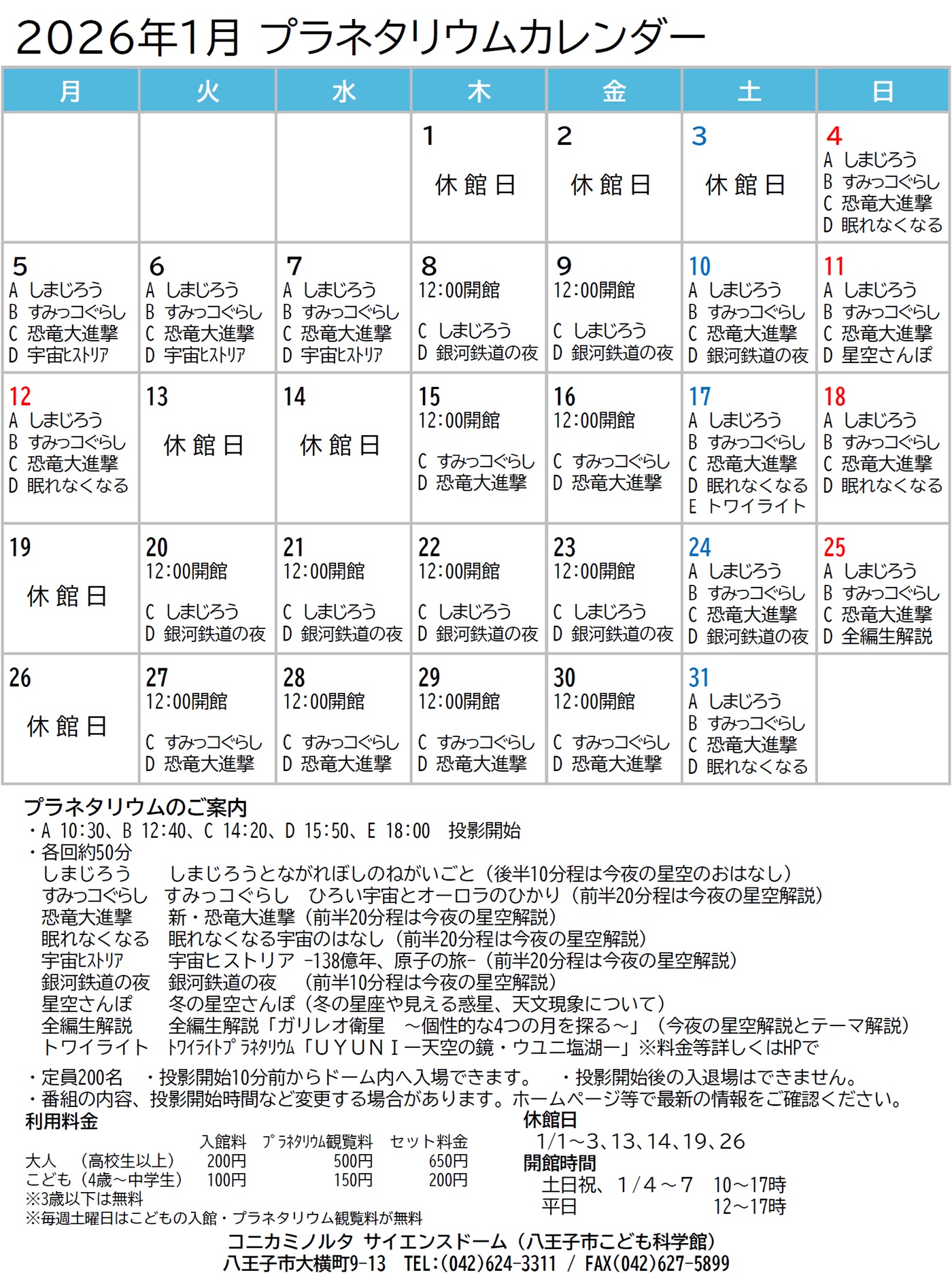 - ドーム内への入場開始時間は各回の投影開始の10分前からとなっております。それ以前には、入場できませんのでご注意ください。