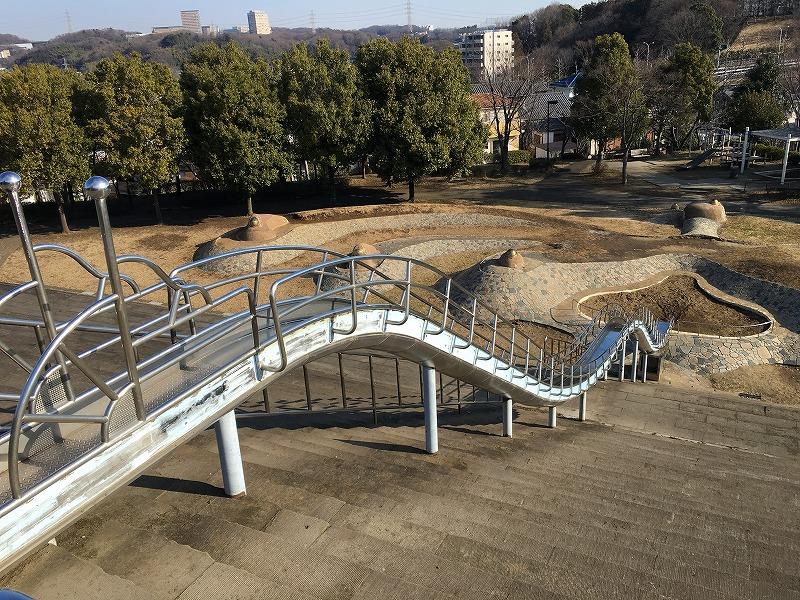斜面を利用した巨大ピラミッドと大型スライダーが特徴の公園です。頂上から多摩丘陵の山並みが見渡せるほか、昔この地にあった秋葉神社にちなんだモニュメントや多目的広場もあり、多くの子ども達でにぎわっています。