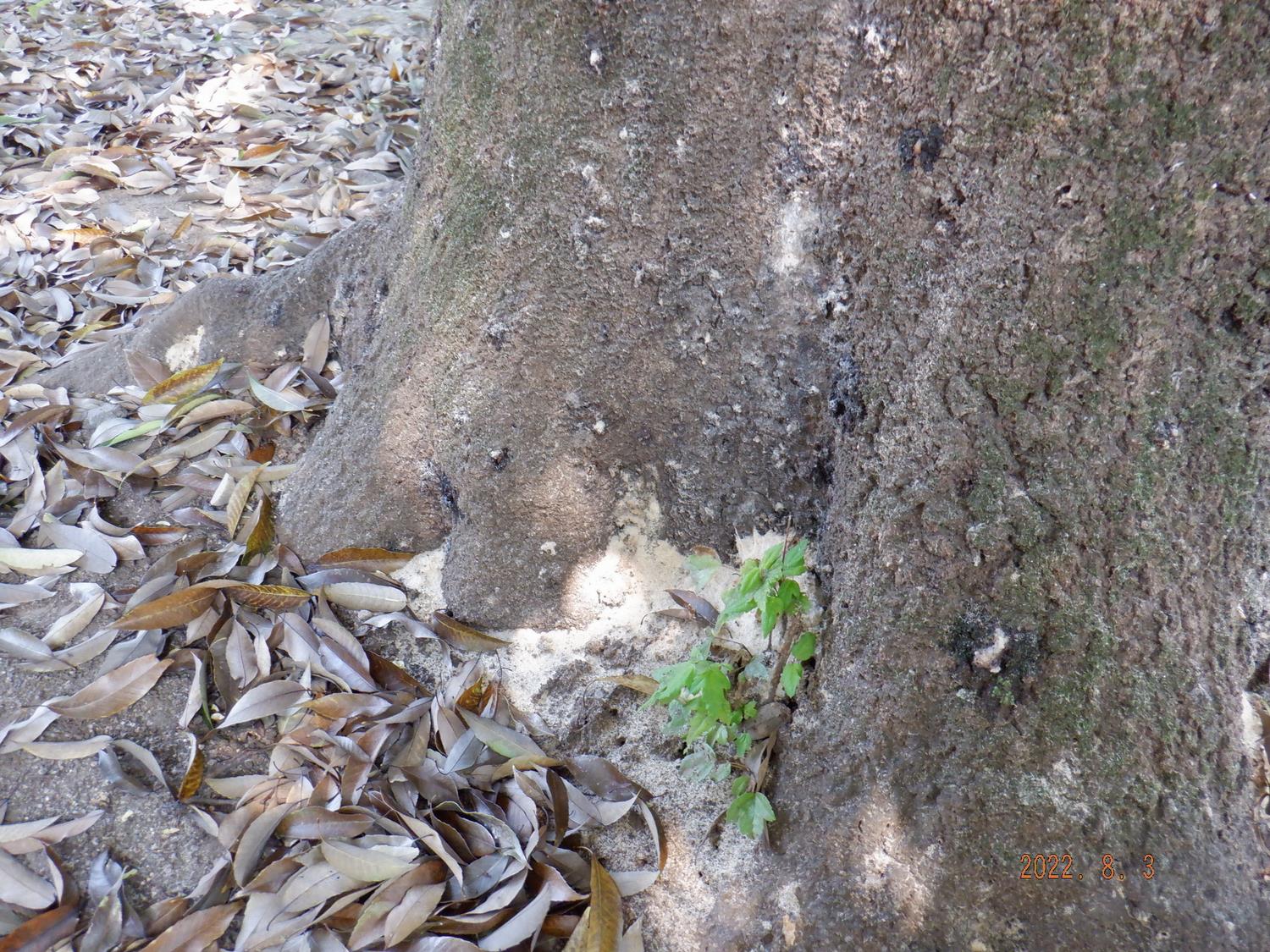 カシノナガキクイムシが入り込んだ樹木は、大量のフラス(木くず)が根元付近に堆積します。