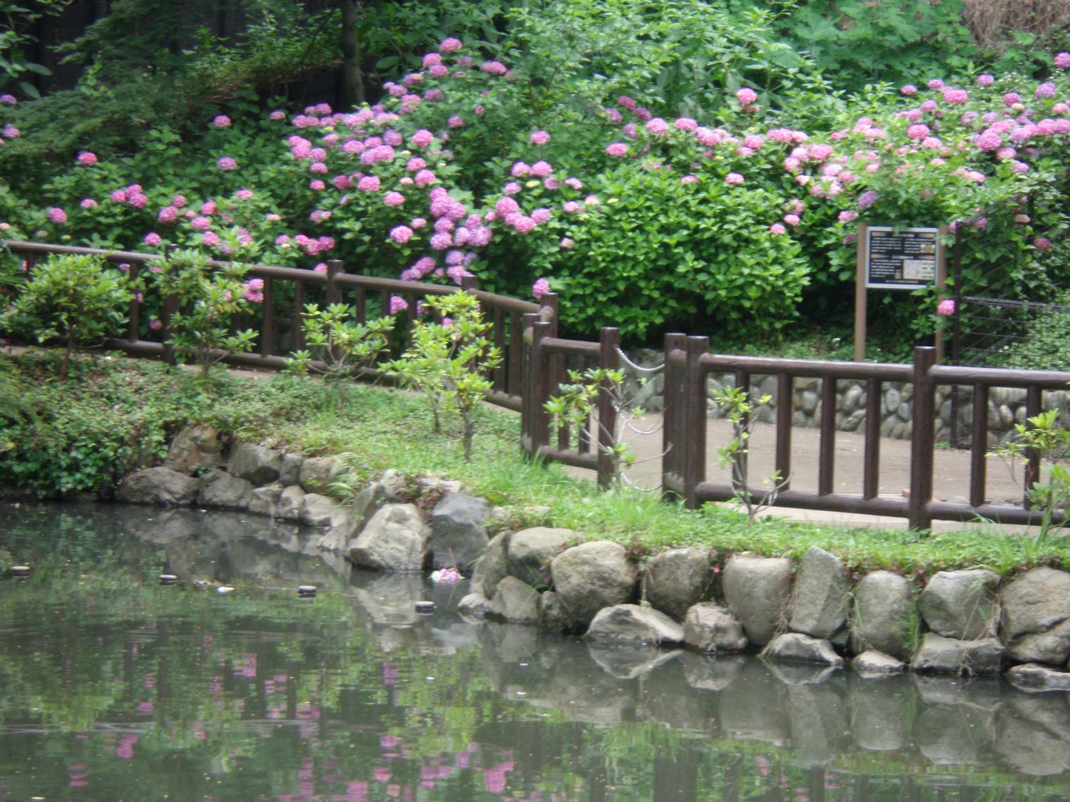 東京の名湧水57選、八王子八十八景に選ばれており、池の周りにはアジサイが植栽されています。梅雨時期には池にアジサイの花が映りきれいです。平成25年及び平成26年に改修工事が行われ、池周辺や園路、広場の整備がされました。大きな複合遊具は子ども達に大人気です。