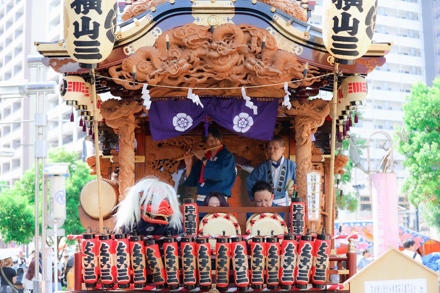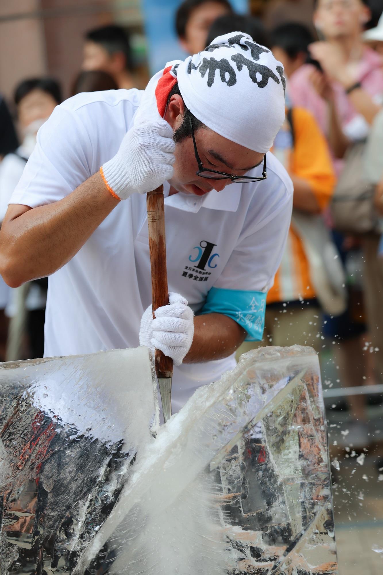 露店も多く、装飾が豪華でかつ搭乗する方のサービス精神も高いのが印象的でした。 放射線通りのところどころではミストが噴射。暑さが和らぎました。氷彫刻の作品は、展示後に触れることもでき、子どもたちが楽しんでいました。