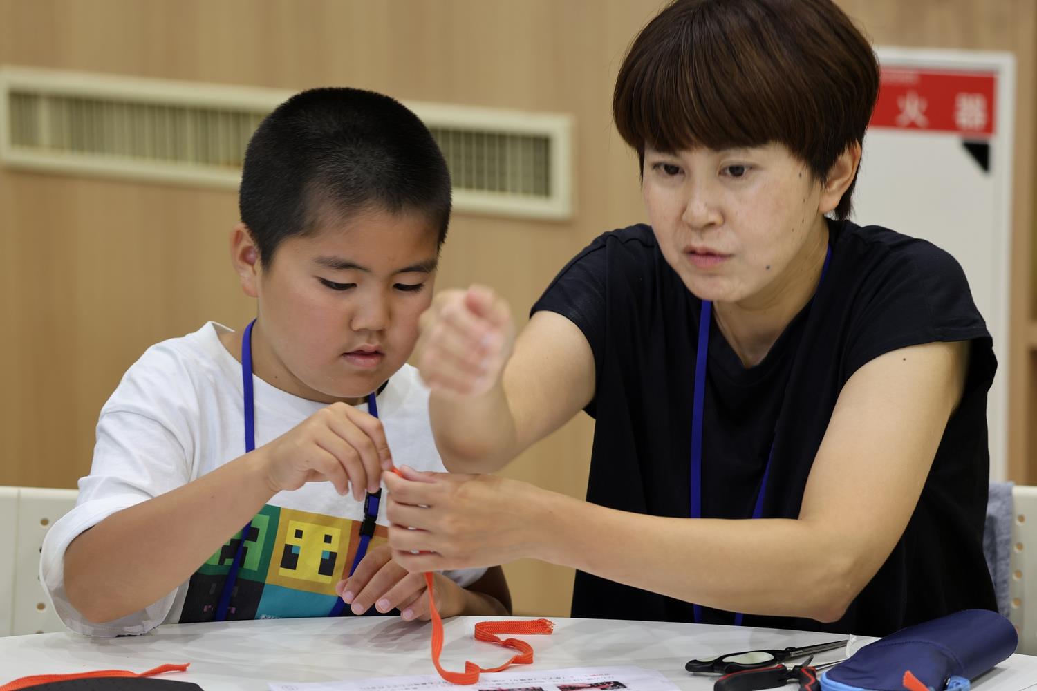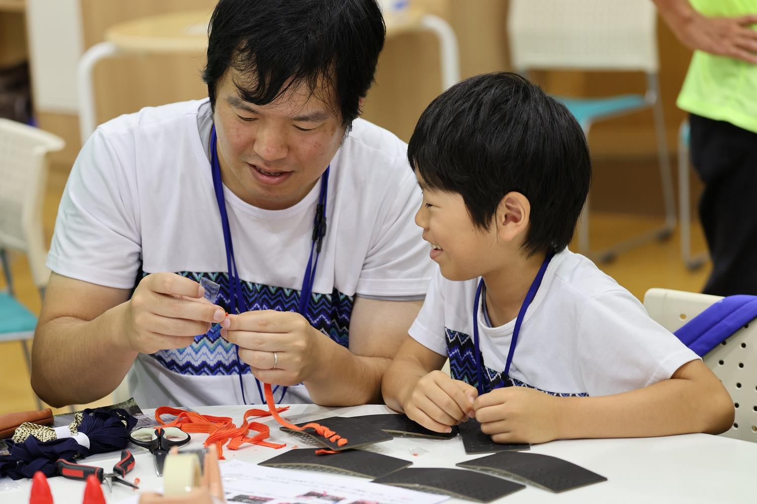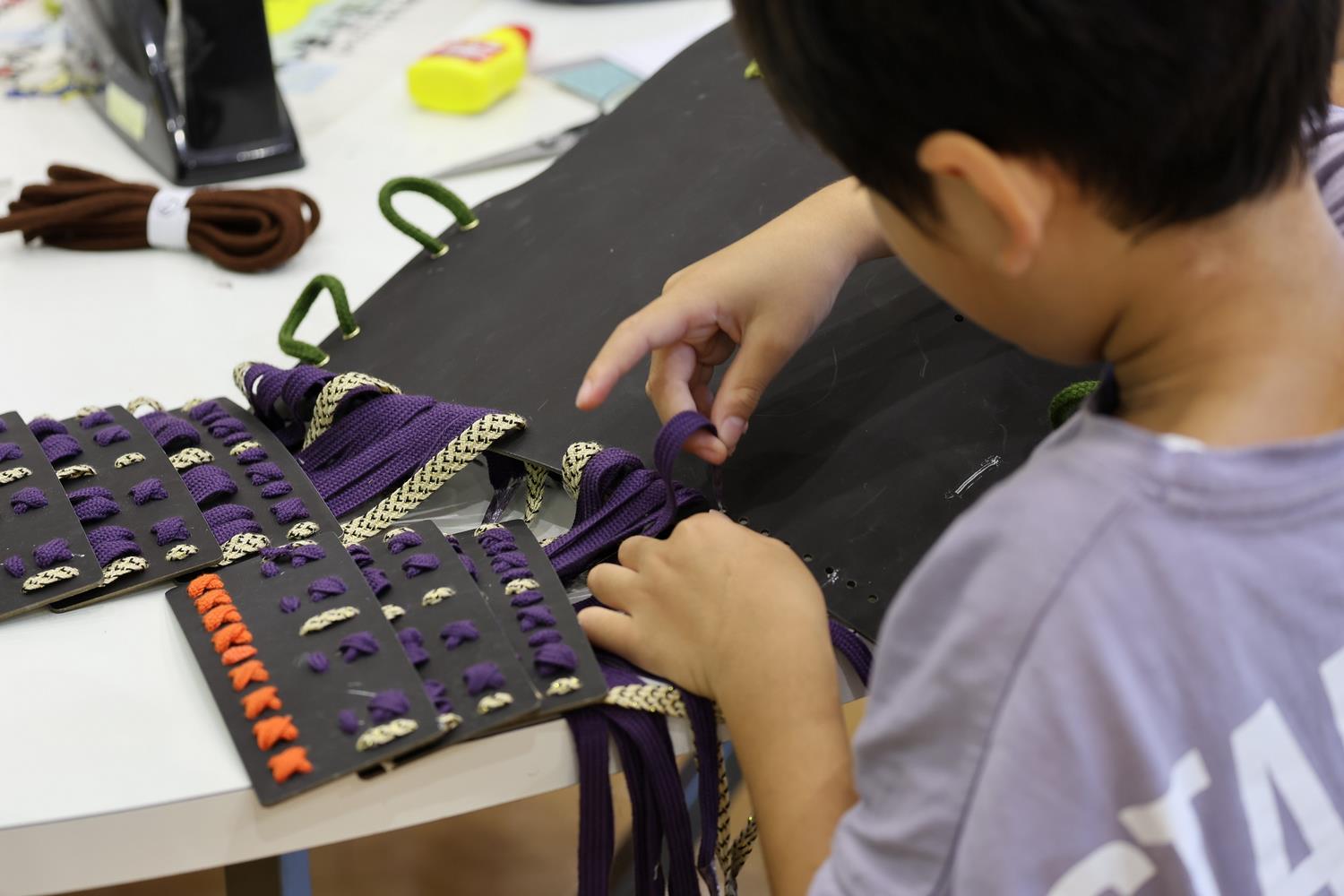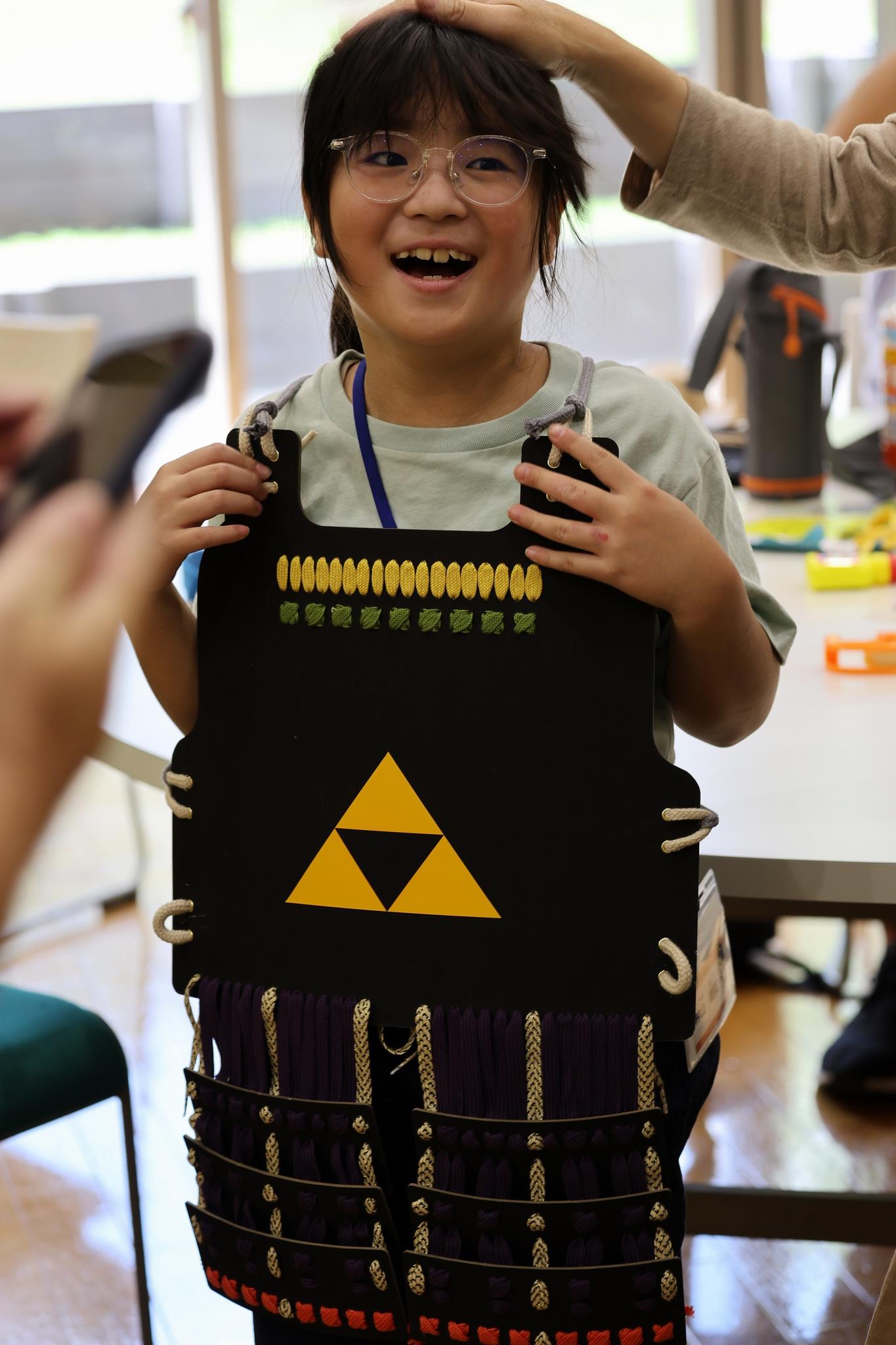 多くの子どもたちが参加しており、活気のある手作り甲冑教室でした。拓殖大学の教授と学生が監修したという手作り甲冑の材料はしっかりした素材で出来ており、紐を編み込んだ甲冑は本格的でした。