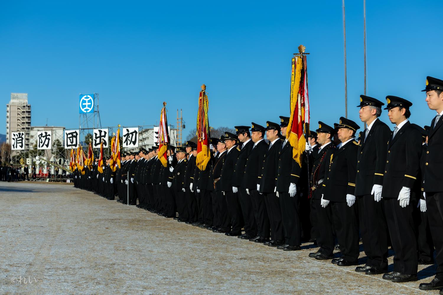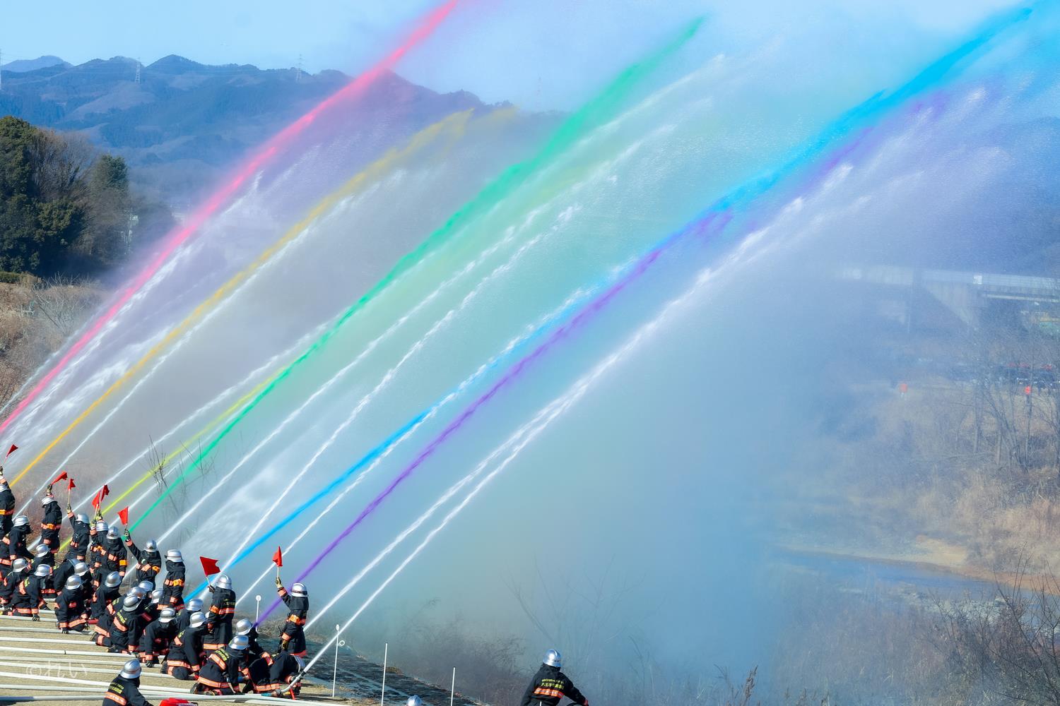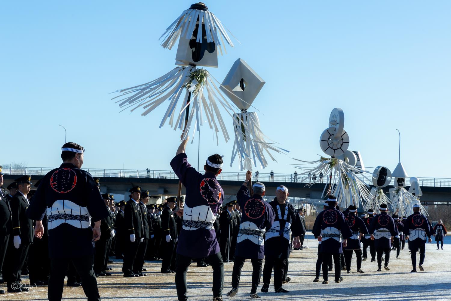 前日に雪が降ったこともあり天気の心配がありましたが、当日は雲ひとつない晴れとなり、非常に清々しい中での出初式でした。伝統的な木遣やはしご乗り、色とりどりの放水などの催しが行われ、河川敷は多くの来場者でにぎわいました。
