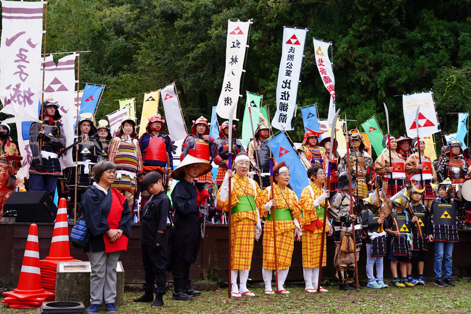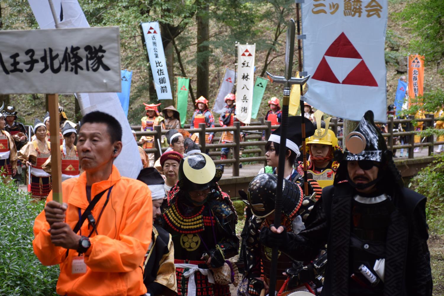 八王子城跡で、地元をはじめ八王子城ゆかりの小田原や伊豆の国などの甲冑武者隊が麓から御主殿跡地までをパレードしました。甲冑武者隊の中には外国人も参列。広場では元八王子地区の町内会の縁日、模擬店が出店し地元の中学生による吹奏楽、幼稚園児のチアリーディング、迫力ある太鼓演舞などが行われ大勢の見物客で賑わっていました。