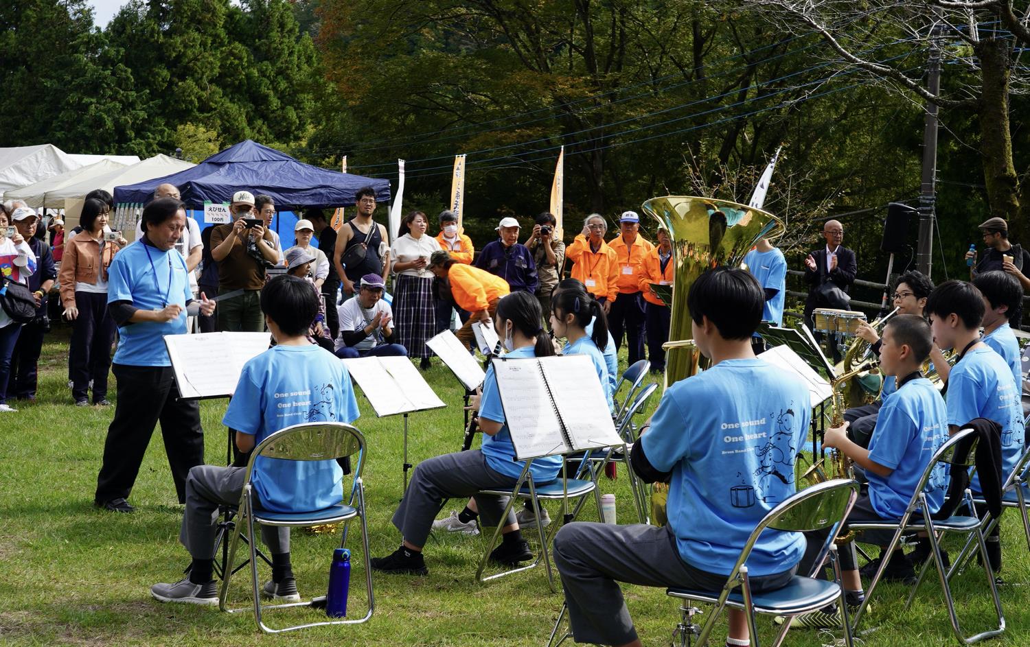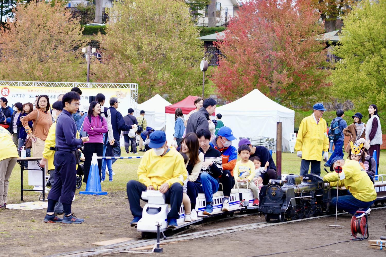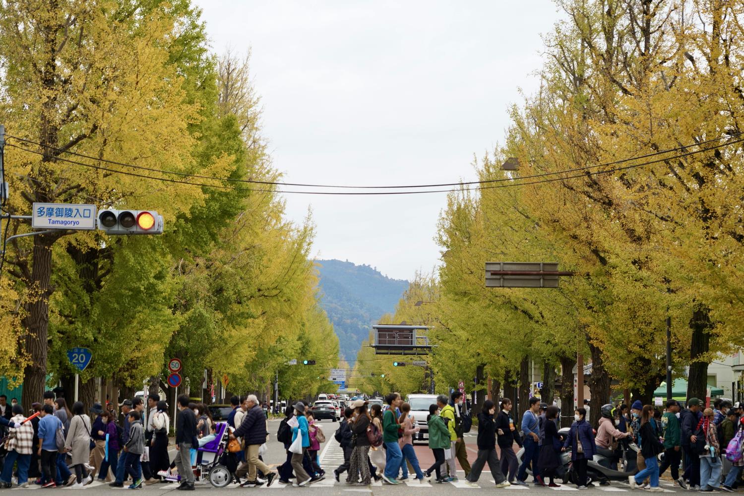 11月16日(土)の 八王子いちょう祭りの初日はあいにくの曇り空で、いちょうの色づきもこれからといったところ。マーチングバンドの勇壮なパレードには甲州街道から多摩御陵の橋まで多くの見物客がスマートフォンを向けていました。各会場でのステージ演技、物産展、屋台、ミニSLなど、どこも行列ができていて、みんなが楽しめるにぎやかなお祭りでした。