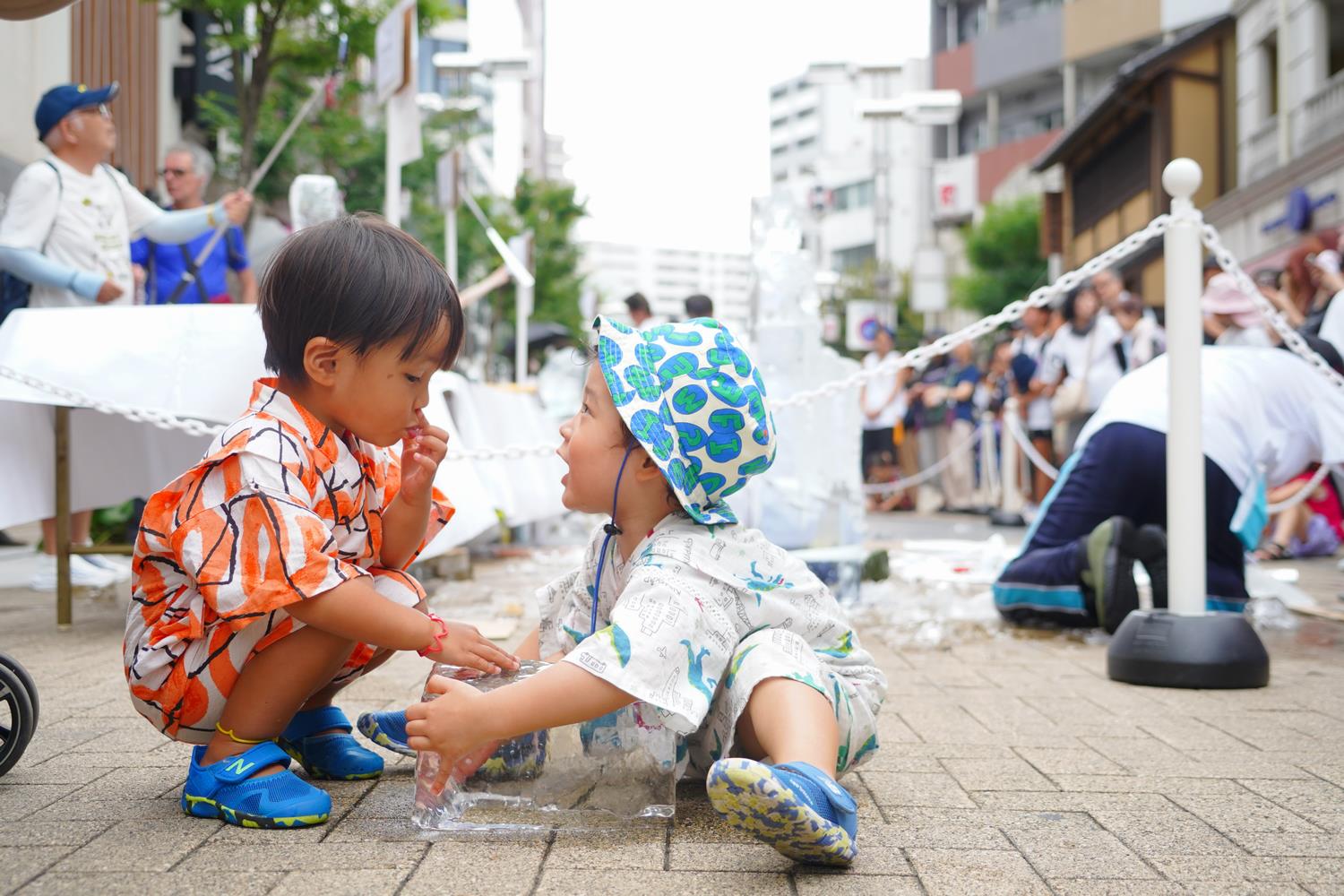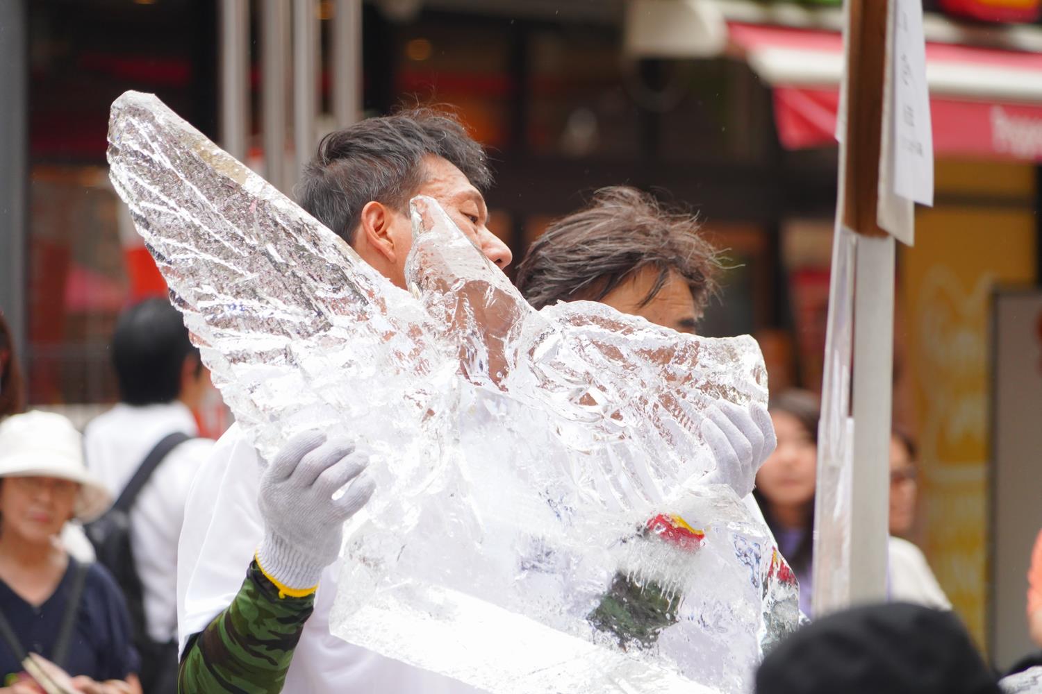 八王子の商店街で開催された氷の彫刻イベントでは、職人たちがノコギリやノミで氷を削り、見事な作品を制作。削る音はASMRのように心地よく、視覚と聴覚の両方を魅了していました。子どもたちは氷に触れてはしゃぎ、浴衣姿の観客も涼を楽しんでいました。宵宮の舞では、かつて織物産業で栄えた八王子では、商談に芸者を呼ぶ接待文化が根付き、唄や踊りで商取引を支えたという歴史の紹介がありました。戦後も接待所として一部が残り、現在も芸妓衆の公演などで当時の面影が伝えられています。