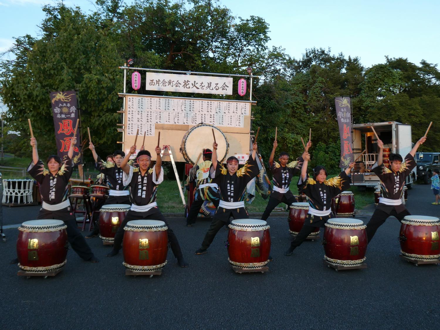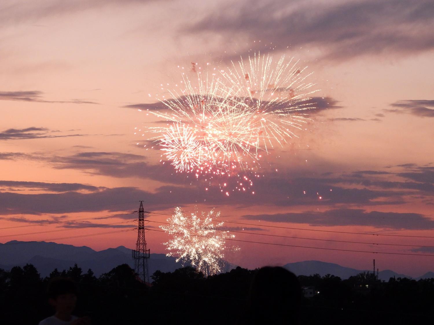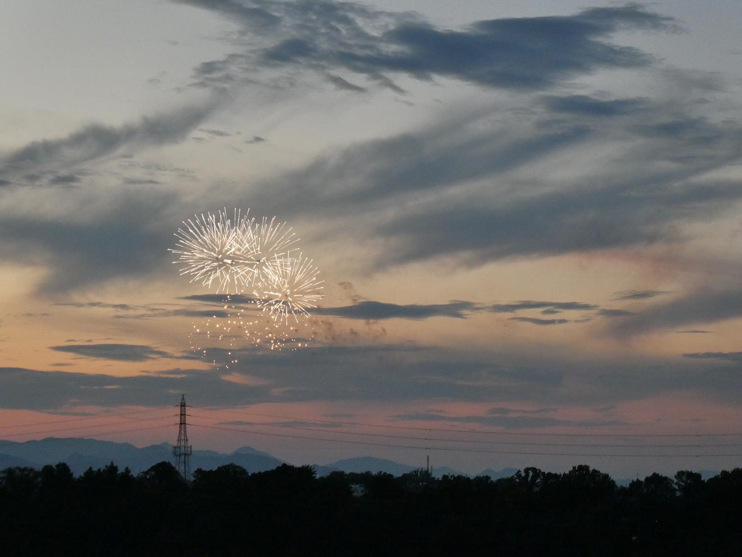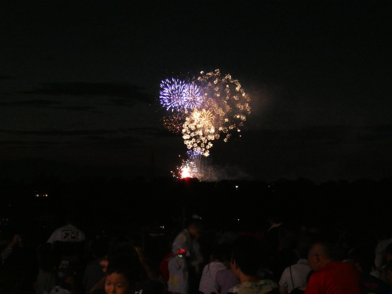 片倉つどいの森公園の芝生広場はたくさんの人達がブルーシートを敷いたり、テーブルやイスを準備したりして花火大会の開始を待っていました。花火の始まる前から和太鼓の演奏等で盛り上がっていました。午後7時過ぎ、丹沢の山々をバックに、まだ明るさが残る西の空に最初の花火が上がり、歓声が上がりました。暗くなってきた7時半過ぎからが本番という感じで、打上げ会場から少し距離はありましたが、みなさんそれぞれに花火を楽しんでいる様子でした。