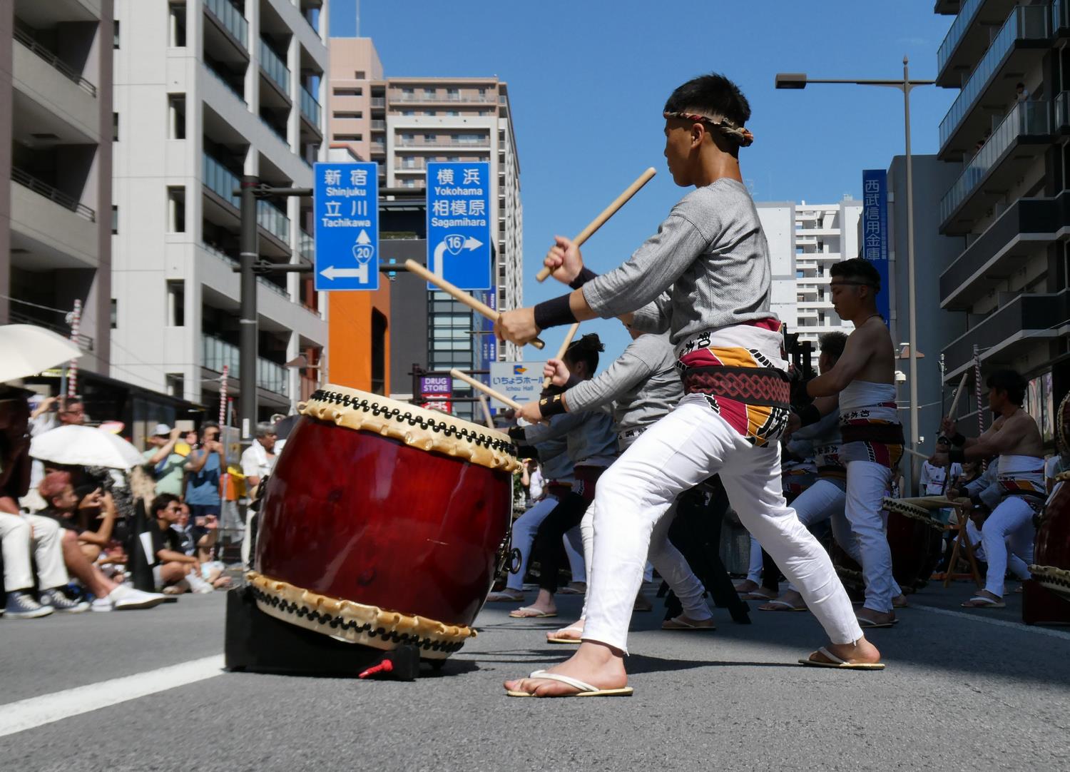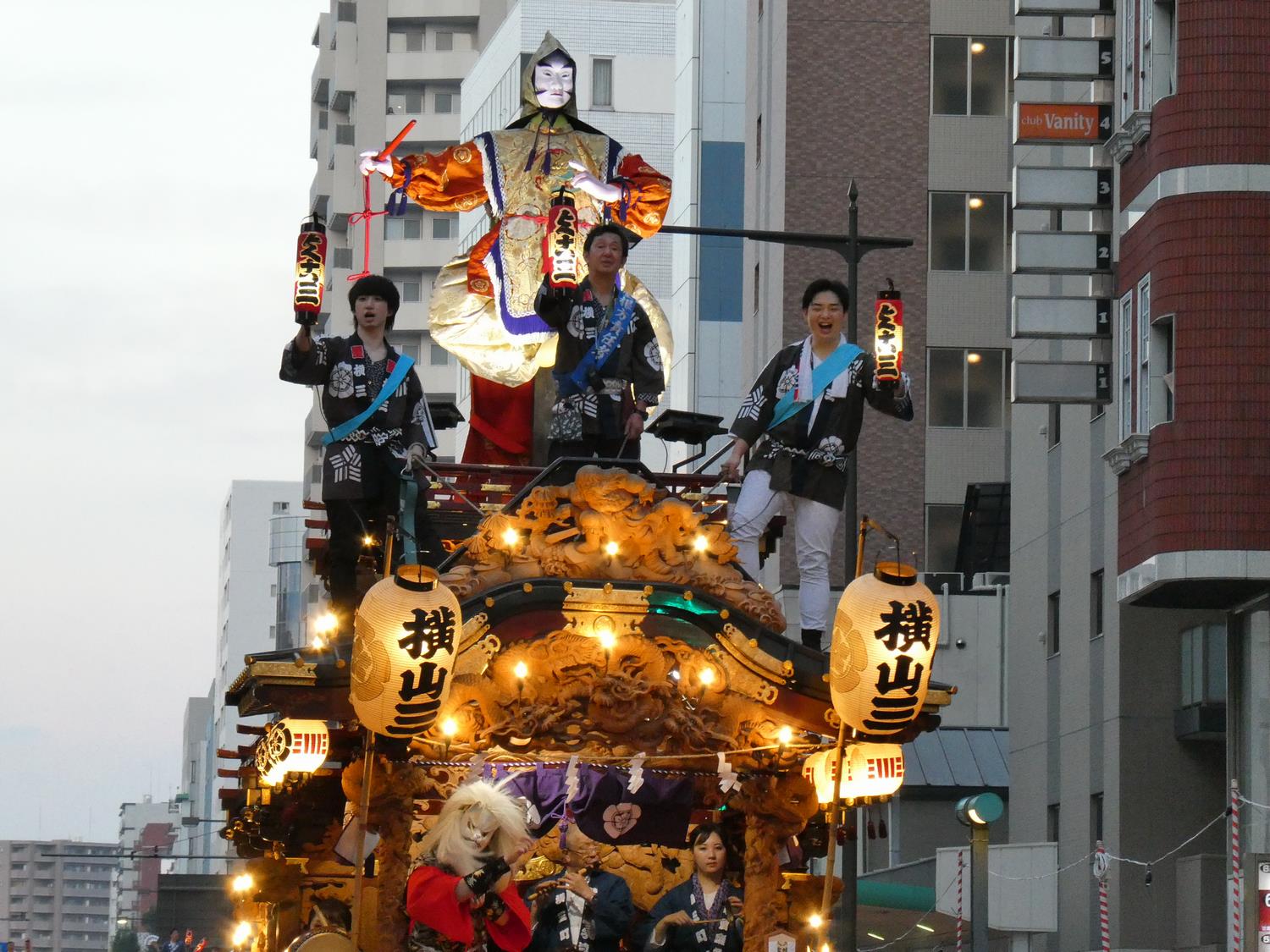 八王子まつり2日目。甲州街道両側の歩道は色々な屋台が続き、多くの人が並んでいました。車道はメインステージとして大迫力の太鼓演奏や大勢の踊り手による民踊流し、豪奢な山車巡行と、途切れることなく楽しい催しが続きました。台湾・高雄市のパフォーマンスもカラフルで楽しく、あっという間に時間が過ぎて夜に。山車もライトアップされて輝き、大変な熱気に包まれた2日目でした。